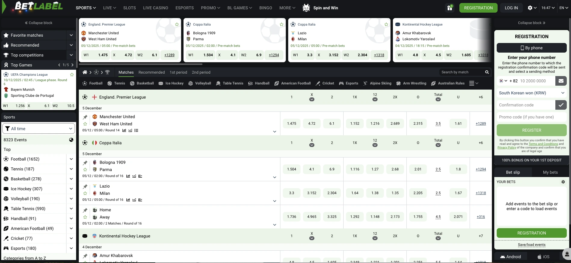 Let's not mince words: the Bet Label Sportsbook is absolutely massive. While many competitors tack on a minimal betting section, Bet Label treats its sports betting arm as a primary product. Our visual inspection confirms a staggering 8,322+ events are available at any given time, covering everything from the world’s most popular leagues to niche markets.